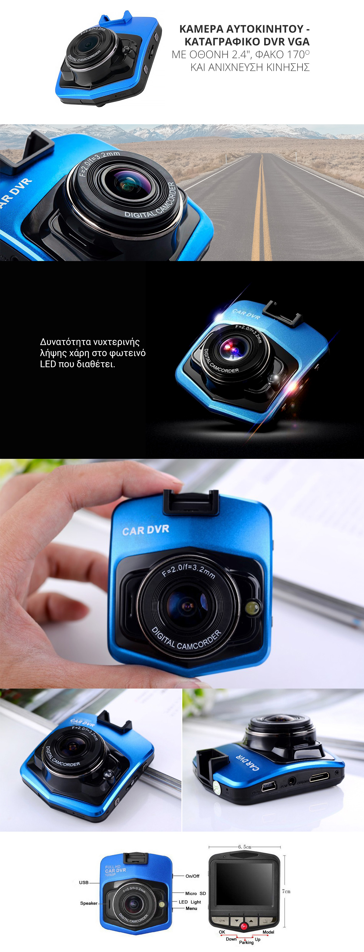 Κάμερα/DVR αυτοκινήτου με φωτάκι LED για νυχτερινή λήψη, φακό με γωνία 170o και καταγραφή VGA με δυνατότητα αναπαραγωγής σε οθόνη TFT LCD 2.4″.