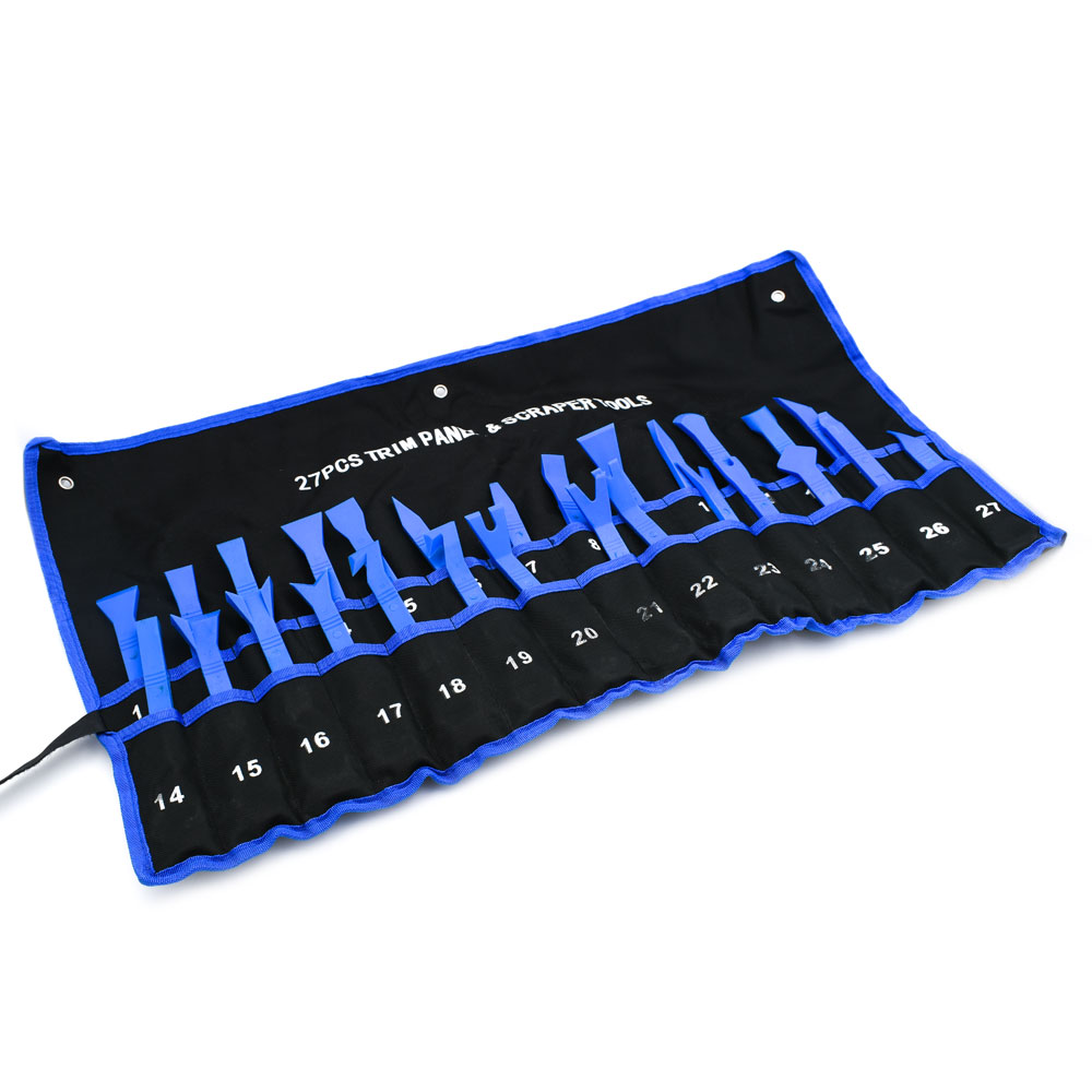 Σετ 27 εργαλείων για την αφαίρεση ταπετσαρίας αυτοκινήτου καθώς και για την αλλαγή του ραδιοκασετόφωνου, GPS, πάνελ, εύκολα και γρήγορα χωρίς την πρόκληση ζημιάς στο αυτοκίνητο. Κάθε εργαλείο είναι περίπου 7.5cm και έρχονται σε υφασμάτινη θήκη που διπλώνει για την μεταφορά και αποθήκευση τους.